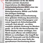 Seit Jahrzehnten ist für die NATO Staaten und den deutschen Imperialismus die Münchener Sicherheitskonferenz (MSC) einer der wichtigsten Termine, um mit Rüstungsindustrie, Militär und Politik ihre blutigen Feldzüge, Waffengeschäfte und Durchsetzung ihrer globalen Ordnung abzustimmen. Das ganze wird bei Champagner und rotem Teppich als Sicherheitspolitik verkauft. Und aktuell – wo diese westliche globale Ordnung ins Wanken gerät – ist es für die Herrschenden der NATO-Staaten immer wichtiger, ihre Macht auch offener mit militärischen Mitteln zu verteidigen. Der Angriff der USA auf Venezuela und die Entführung Maduros sind eine neue Stufe der gewaltsamen Durchsetzung dieser „Ordnung“.