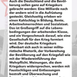 Auch die Deutschland und die Bevölkerung sollen ganz auf Kriegskurs gebracht werden: Eine Milliarde nach der andern wird in die Aufrüstung gesteckt. Gleichzeitig erleben wir einen Kahlschlag in Bildung, Rente, Arbeitnehmerrechten und Sozialstaat. Das ist Großangriff auf die Lebensbedingungen der arbeitenden Klasse, und ein Vorgeschmack darauf, wie eine Gesellschaft für den Krieg formiert wird. Der deutsche Kriegskurs offenbart sich auch in seiner militaristische Rhetorik, der Vorbereitung der Bevölkerung auf den Kriegsfall wie mit der Wiedereinführung der Wehrpflicht. Meinungen, die dem Kriegskurs widersprechen, werden mit Faustschlägen und Entlassungen bestraft und Überwachung und Repression nach Innen ausgeweitet.