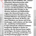 Egal was sie uns erzählen: Um „unsere“ Sicherheit oder um Menschenrechte und Demokratie ging es hierbei nie, sondern um Einflusssphären, Ressourcen und Absatzmärkte. Das wird heute immer deutlicher: Die NATO unterbindet jeden Frieden in der Ukraine, befeuert mit Waffenlieferungen den Genozid Israels an der palästinensischen Bevölkerung und schüttelt Mördern wie Erdogan oder Netanjahu die Hand. Al Sharaa, der neue Präsident von Syrien mit IS-Verbindungen, steht ebenso auf der Liste der „westlichen Verbündeten“. Er lässt aktuell die selbstverwalteten kurdischen Gebiete in Syrien angreifen, die die Genoss:innen dort tapfer verteidigen (aktueller Aufruf von Riseup4Rojava).