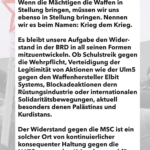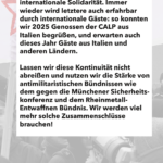Der Widerstand gegen die MSC ist ein solcher Ort von kontinuierlicher konsequenter Haltung gegen die NATO, gegen den Kriegskurs und für internationale Solidarität. Immer wieder wird letztere auch erfahrbar durch internationale Gäste: so konnten wir 2025 einen Genossen der CALP aus Italien begrüßen, und erwarten auch dieses Jahr Gäste aus Italien und anderen Ländern.