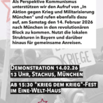 Lassen wir diese Kontinuität nicht abreißen und nutzen wir die Stärke von antimilitaristischen Bündnissen wie dem gegen die Münchener Sicherheitskonferenz und dem Rheinmetall-Entwaffnen Bündnis. Wir werden viel mehr solche Zusammenschlüsse brauchen! Als Perspektive Kommunismus unterstützen wir den Aufruf von „In Aktion gegen Krieg und Militarisierung München“ und rufen ebenfalls dazu auf, am Samstag den 14. Februar 2026 nach München in den revolutionären Block zu kommen. Nutzt die lokalen Strukturen in Bayern und darüber hinaus für gemeinsame Anreisen.