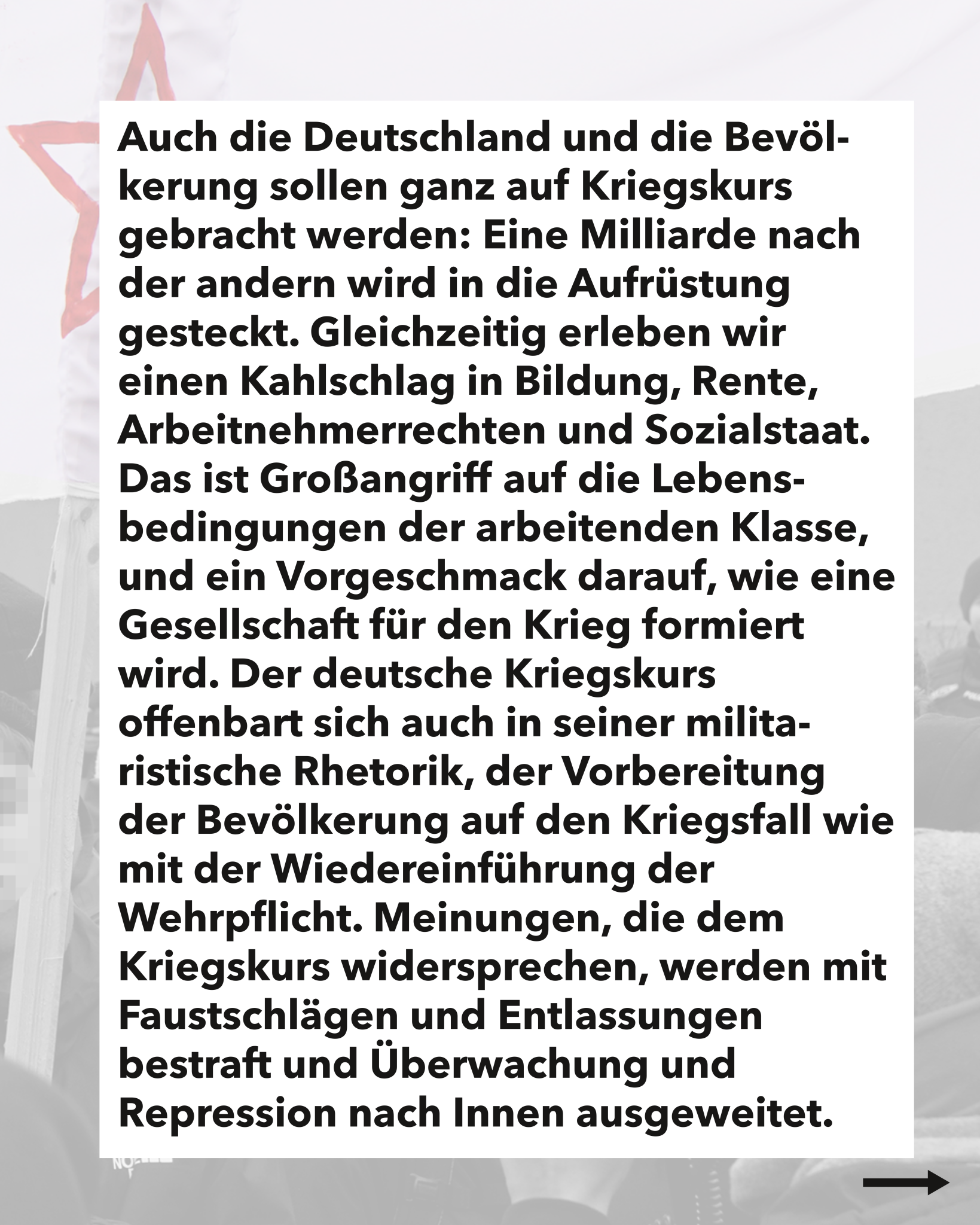 Auch die Deutschland und die Bevölkerung sollen ganz auf Kriegskurs gebracht werden: Eine Milliarde nach der andern wird in die Aufrüstung gesteckt. Gleichzeitig erleben wir einen Kahlschlag in Bildung, Rente, Arbeitnehmerrechten und Sozialstaat. Das ist Großangriff auf die Lebensbedingungen der arbeitenden Klasse, und ein Vorgeschmack darauf, wie eine Gesellschaft für den Krieg formiert wird. Der deutsche Kriegskurs offenbart sich auch in seiner militaristische Rhetorik, der Vorbereitung der Bevölkerung auf den Kriegsfall wie mit der Wiedereinführung der Wehrpflicht. Meinungen, die dem Kriegskurs widersprechen, werden mit Faustschlägen und Entlassungen bestraft und Überwachung und Repression nach Innen ausgeweitet.
