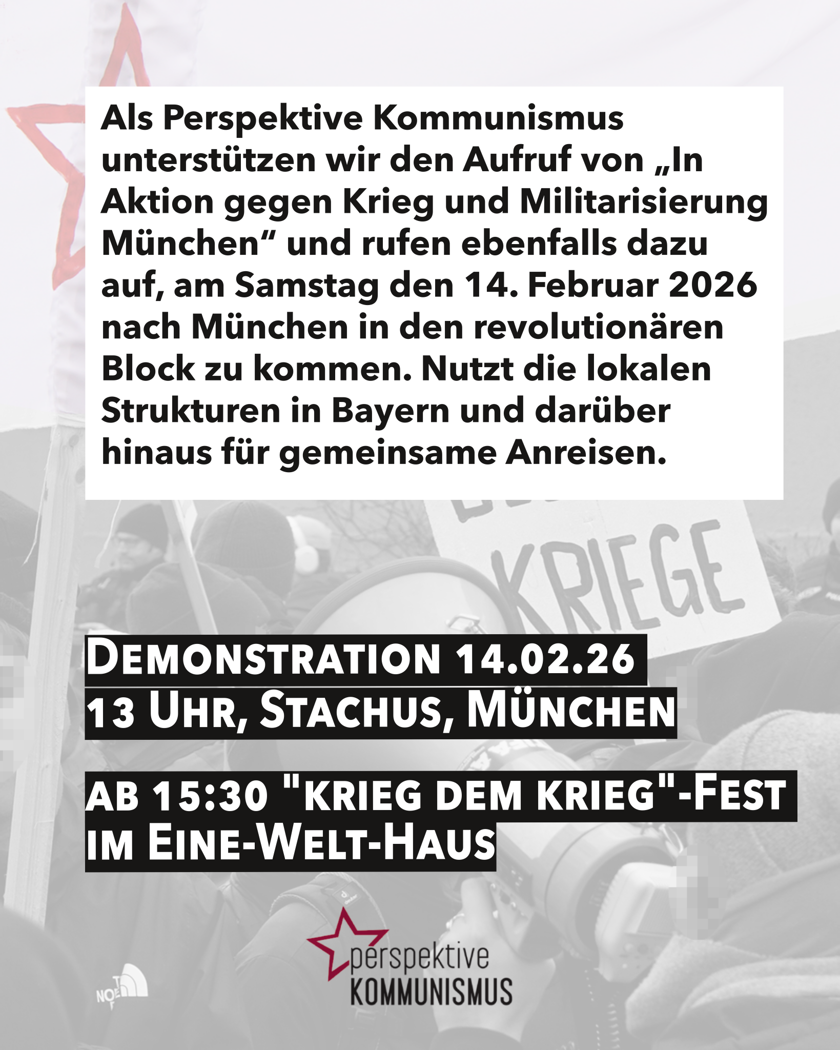Lassen wir diese Kontinuität nicht abreißen und nutzen wir die Stärke von antimilitaristischen Bündnissen wie dem gegen die Münchener Sicherheitskonferenz und dem Rheinmetall-Entwaffnen Bündnis. Wir werden viel mehr solche Zusammenschlüsse brauchen! Als Perspektive Kommunismus unterstützen wir den Aufruf von „In Aktion gegen Krieg und Militarisierung München“ und rufen ebenfalls dazu auf, am Samstag den 14. Februar 2026 nach München in den revolutionären Block zu kommen. Nutzt die lokalen Strukturen in Bayern und darüber hinaus für gemeinsame Anreisen.