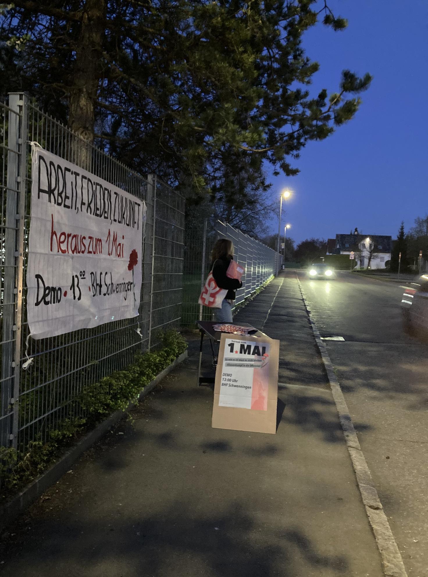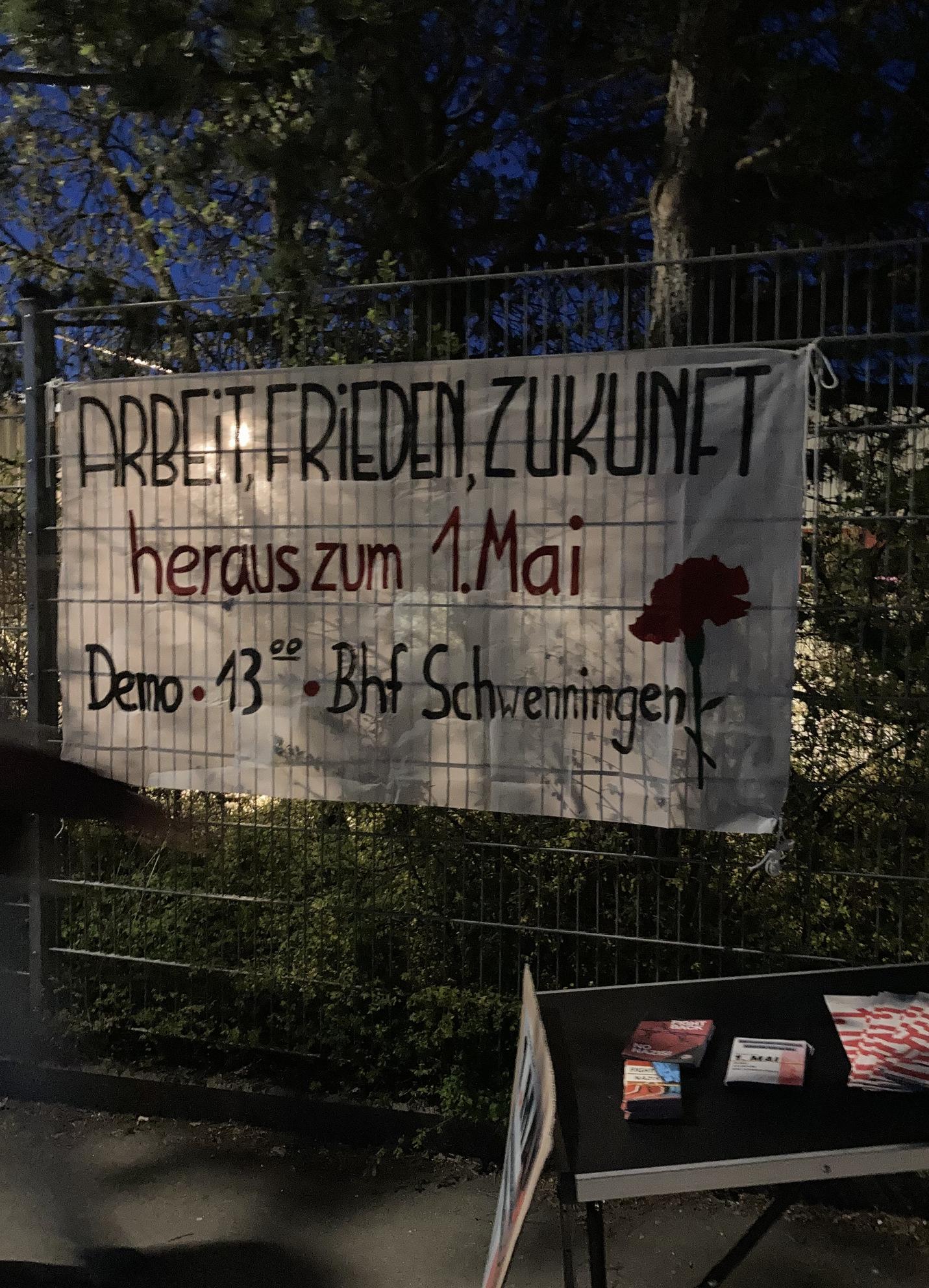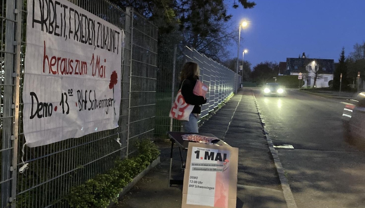 Die Mobilisierung zum 1.Mai und Demonstration in Schwenningen läuft. Plakate sind in den Straßen sichtbar, Mai Zeitungen werden an Betrieben verteilt und in verschiedenen Formen wird aufgegriffen wofür der 1.Mai steht: Gegen Faschismus, Krieg und Krise, für die internationale Solidarität, den revolutionären Bruch mit den herrschenden Verhältnissen und eine sozialistische Perspektive.
